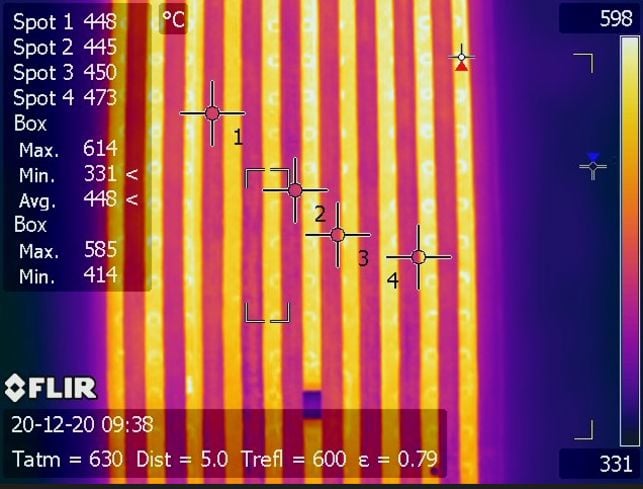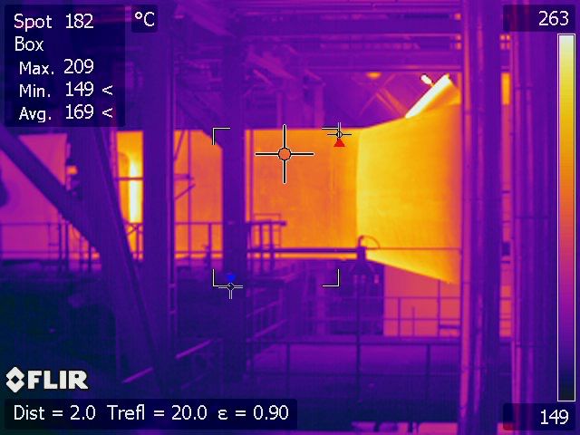 Refractory or ceramic blankets inside, refractory lined equipment, boiler, heater shell, or stack get dislodged due to spalling and other issues, causing an increase in the heater casing temperature at various locations. These high temperature zones are captured in infrared images as hot spots. Infrared thermography can be used to monitor the extent of refractory damage. From an energy efficiency point of view, these types of applications are most useful.