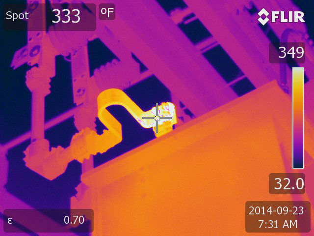 Downtime can stretch on for days, which is why regularly scheduled maintenance, including IR, is so important. Generally one 12-hour shift per month is allotted to predictive maintenance applications. Issues such as overheating boom cylinders {Figure 3) that can be caught during regularly scheduled maintenance prior to malfunction can mean the difference between a fix during a 12-hour shift or losing $180,000 per hour in production and purchasing a new electric 7200 V rope shovel, which will cost several million dollars.