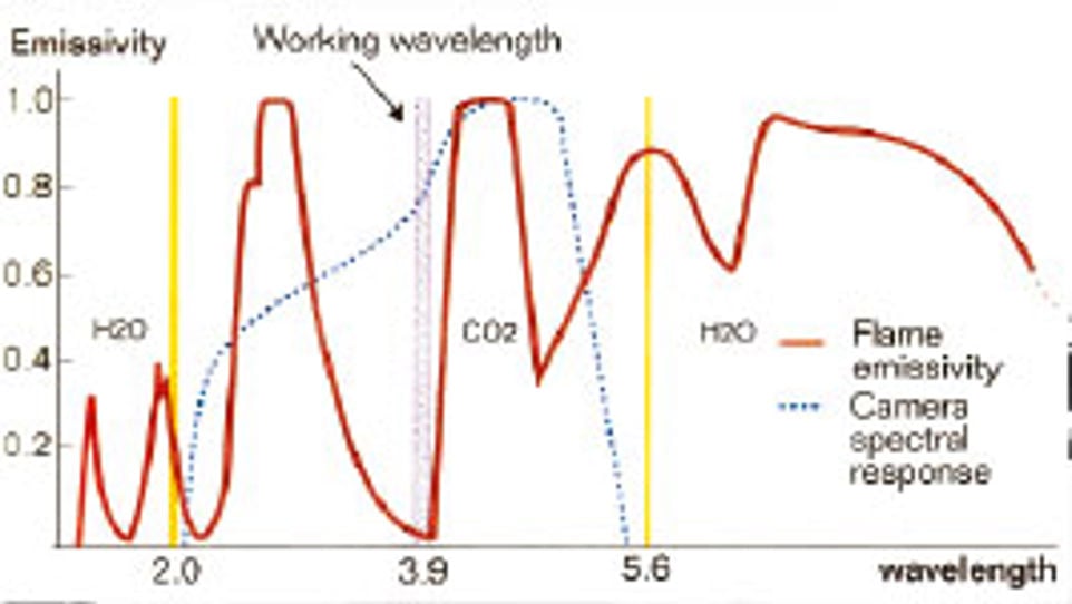 The small grey area indicates the part of the spectrum where the combination of high camera sensitivity and low flame emissivity makes it possible to see through flames.