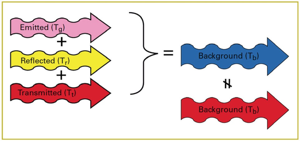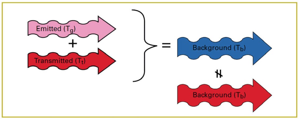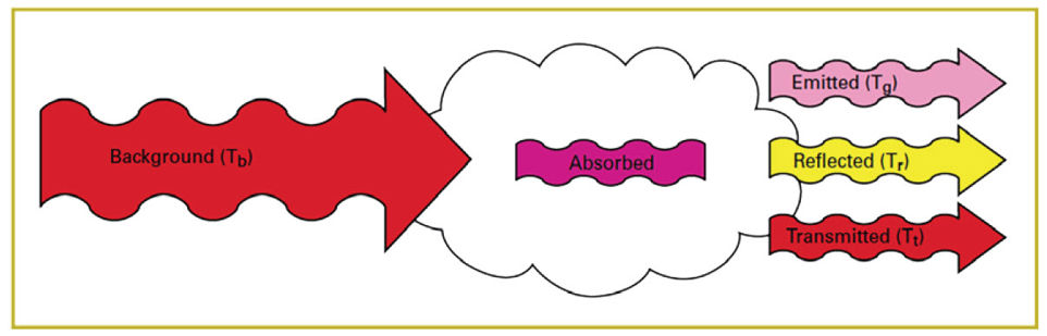 In reality, the amount of radiation reflected from the molecules in the cloud is very small and can be ignored. So the key to making the cloud visible is a difference in apparent temperature between the cloud and the background (Figure 13).