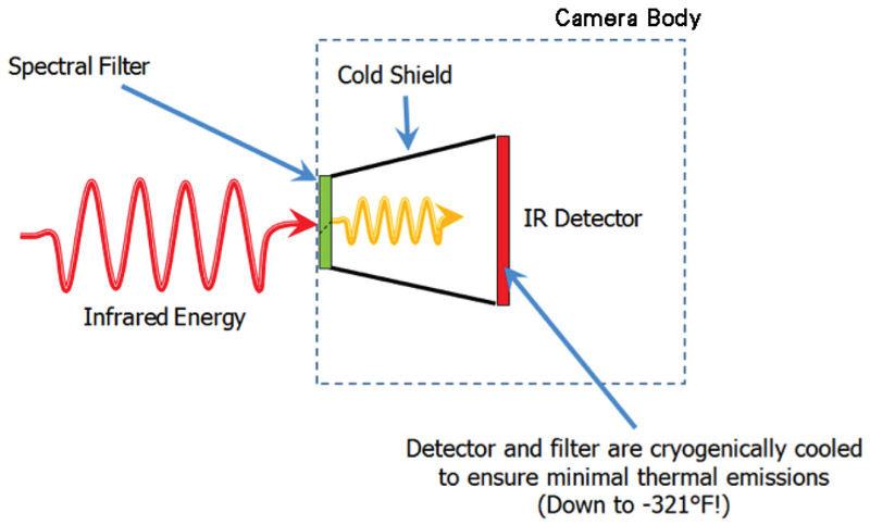 The OGI camera uses a unique spectral filter method that enables it to detect a gas compound. The filter is mounted in front of the detector and cooled along with it to prevent any radiation exchange between the filter and the detector. The filter restricts the wavelengths of radiation allowed to pass through to the detector to a very narrow band called the band pass. This technique is called spectral adaptation.