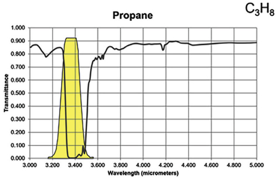 For the majority of gas compounds, infrared absorption characteristics are wavelength dependent. In Figures 3A and 3B, the absorption peak for propane and methane are demonstrated by the severe drop in transmittance lines on the graphs. The yellow regions represent a sample spectral filter used in an OGI camera, which is designed to correspond to the wavelength range where most background infrared energy would be absorbed by the particular gas of interest.