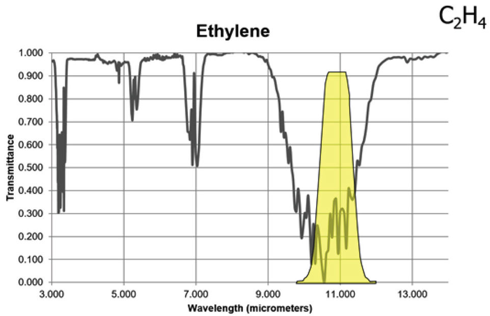 Ethylene has two strong absorption bands, but a longwave sensor will detect this gas with greater sensitivity than a midwave sensor based on the transmittance curve shown below.