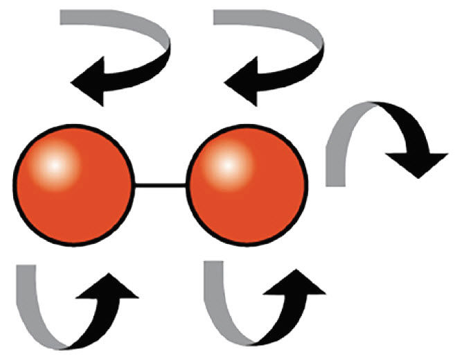 The next most complex category of molecules is homonuclear, made of two atoms such as hydrogen (H2), nitrogen (N2), and oxygen (O2). They have the ability to tumble around their axes in addition to translational motion.