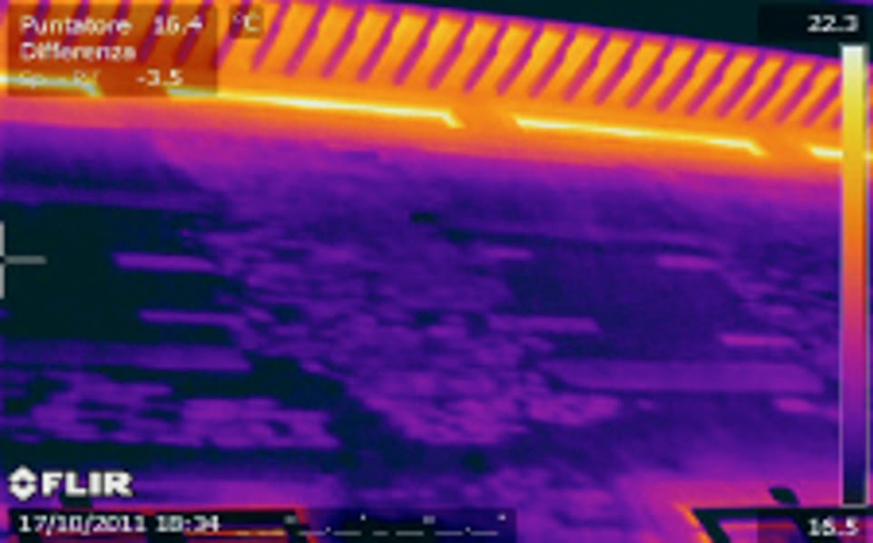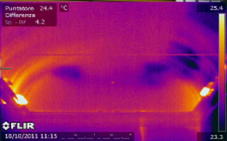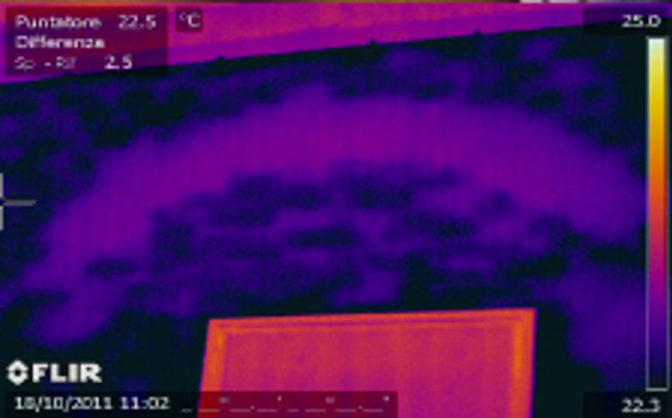 In this thermal image the dark spots indicate moisture ingress in the vaults of the Museum of the Academy.