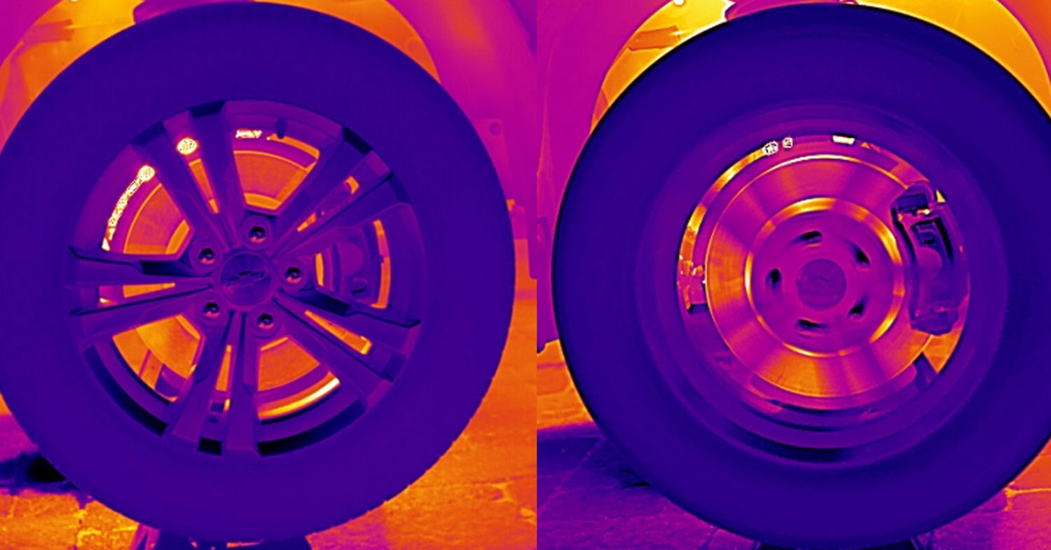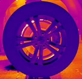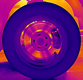 These IR images compare the capture results of a tire rotating at 20mph. The one of the left was taken with a cooled thermal imaging camera. One would think the tire is not spinning, but this is the result of a very fast capture rate of the cooled camera that has stopped the motion of the tire. The uncooled camera capture rate is simply too slow to capture the rotating tire causing the wheel spokes to appear transparent.