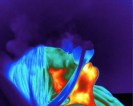 The second example uses a Nitrous Oxide filter that filters to where Nitrous Oxide is absorptive to the IR and therefore we can “see it” with the cooled thermal camera. The application was to design a better Nitrous Oxide mask and scavaging system; so the first video is imaging the older mask design and the second video is imaging the new mask design. As you can see, the older mask design is leaking a lot of Nitrous gas into the room, which is concerning for many reasons. The new mask design has minimal leakage and appears to be a better solution.