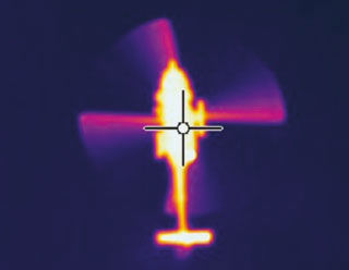 Note how the fast integration time offered by the cooled camera stopped the motion of the blade, allowing for accurate measurement of the blade surface as well as te heating coils. In contrast, the blades are moving too fast to be recorded by the uncooled camera. Any temperature measurements taken of the coils would be too low, because the coils are actually being blocked by the moving blades.