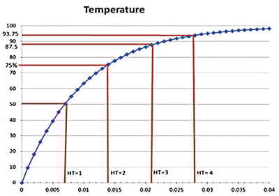 A fun way to think about a microbolometer detector’s time response is to pretend that you have two buckets of water. One bucket is full of well-stirred ice water at 0°C and the other is at a rapid boil at 100°C. Allow the microbolometer to stare at the ice water and then instantaneously switch to the boiling water (a 100°C step input) and plot the resulting temperature. If we convert the thermal time constant of 10 ms into a half time to make for easier math, we get something around 7 ms.