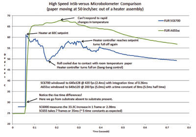 Both a cooled photon counting camera and a microbolometer camera were used to capture side by side data. Figure 3 shows that the data from the two types of cameras look dramatically different. The data from the microbolometer shows a big, relatively steady bump in temperature along the length. The data from the photon counting camera shows significant variations in temperature over time. The cooled camera shows that the heated roller assembly cooled down due to contact with the paper over the first revolution. The bang-bang controller sensed the temperature drop and turned the heater controller fully on again in response. As a result, the roller heated up until the set point was reached and then shut off and the process repeated. This one graph was enough to convince the R&D engineer of two things – a photon counting camera was required for testing the product and that a PID control system must be implemented on the heated roller instead of the simple bang-bang controller if the desired design objectives were to be met.