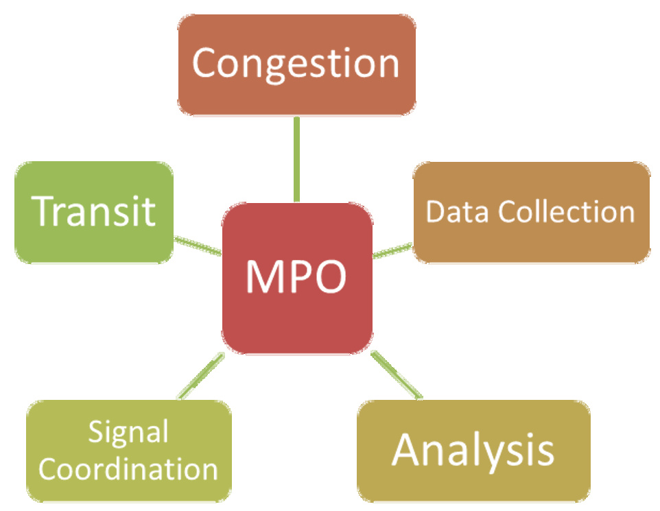 Metropolitan Planning Organizations, or MPOs, are faced with unique challenges for addressing transportation issues across multiple jurisdictions. Often these agencies influence policy and set guidelines for multiple municipalities across a metropolitan area and can help provide a centralized mechanism for sharing information across these agencies. In many places, an MPO is the focus for establishing policies for managing congestion, data collection, analysis, signal coordination and public transit.