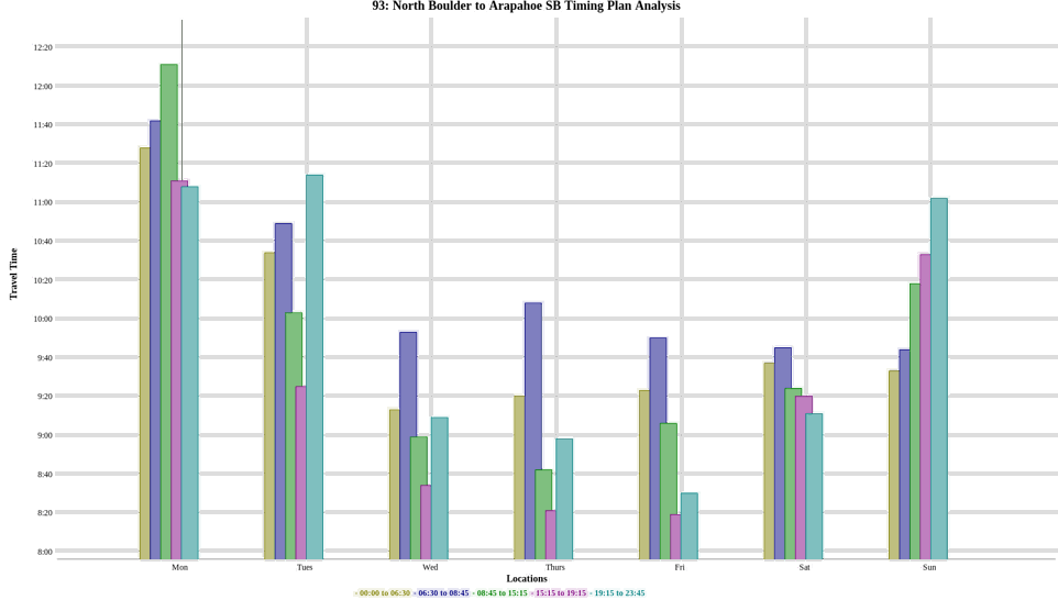 In addition, Acyclica’s analytic tools provide the ability to analyze signal timing plans to gauge their effectiveness. The figure below shows the analysis of a route by displaying the travel-time during each timing plan to help traffic engineers evaluate the need for signal retiming. And with Acyclica's centralized interface, agencies can share data among each other if desired. The ability to share data is left entirely to the user.