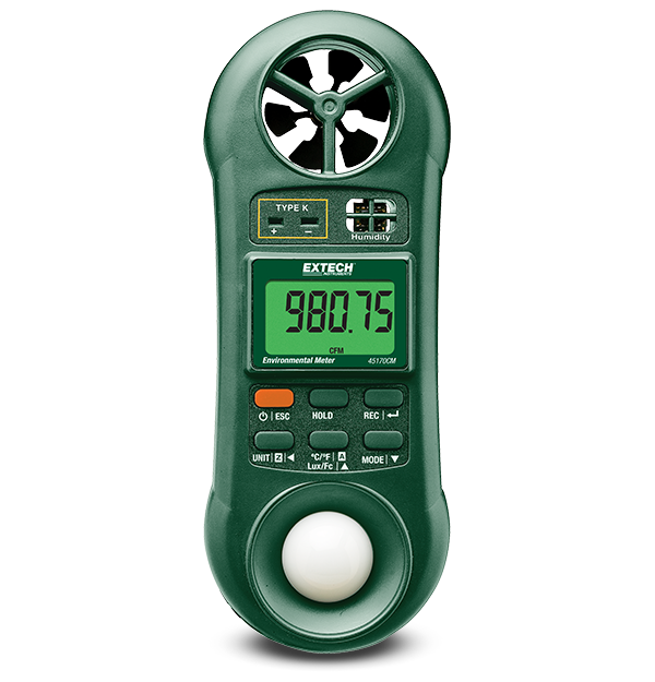 The Extech 45170CM is a convenient 5-in-1 Environmental Meter which measures air velocity, air volume, humidity, temperature, and light. It features ergonomic housing design with a large dual smart LCD where characters on display reverse direction depending on the function in use. Other features include data hold, min/max, auto power off functions. This multi-functional meter is ideal for professional or home use in testing the environmental quality in a building. Complete with built-in sensors, wrist strap and a 9 V battery.