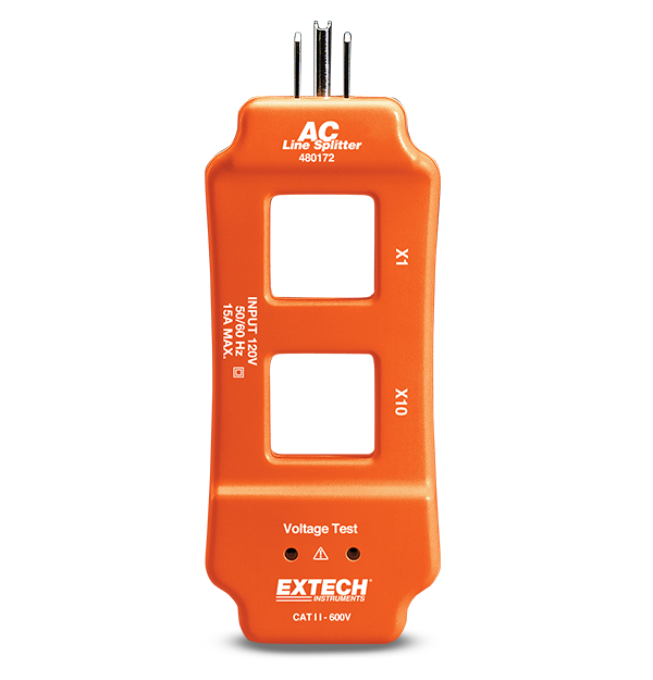 This Extech 480172 Line Splitter provides a fast and easy way to “open” standard 120 Volt AC electrical lines, eliminating the need to cut off the plug and separate the conductors. When connected between a 120 Volt AC outlet and a device under test, this splitter separates the hot/live conductor from the neutral and ground, which enables users to measure AC current up to 15 Amp on a two-wire or three-wire lines using a clamp meter. This splitter also features two Voltage Test jacks so that voltage can be measured using a multimeter.