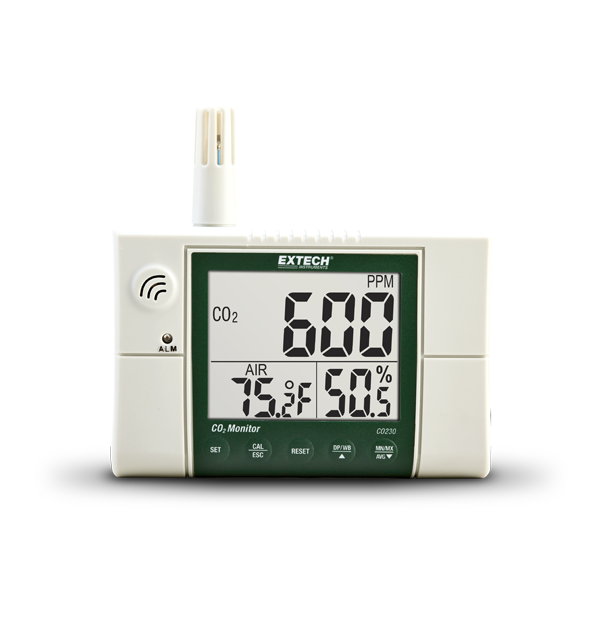 The Extech CO230 measures carbon dioxide (CO₂), air temperature, and humidity. It features automatic baseline calibration (ABC) with disable for use in areas with continuously elevated CO2 levels. Its alarm function with user settable high/low CO2 level is perfect for monitoring air quality and ensuring proper air ventilation in conference rooms, schools, greenhouses, factories, hotels, hospitals and anywhere that high levels of carbon dioxide are generated. The CO230 also calculates dew point and wet bulb values, min/max CO2 value recall, and statistical weighted averages of TWA (eight hour time weighted average) and STEL (15 minute short term exposure limit). Alarm relay output for ventilation control and wall mount. Complete with Universal AC adaptor and multiple plug types (US, EU, UK, AUS).