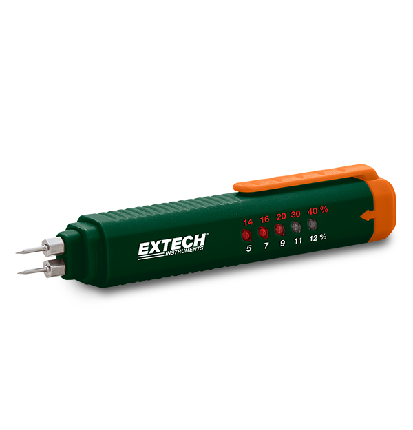 The Extech MO25 is a lightweight, pen-styled compact moisture meter for wood and building materials. After selecting one of ten moisture levels, the user is signaled via audible alert and LED indicator lights that the object being tested surpasses the given threshold. This moisture pen features a data hold function, battery level check and automatically powers off when not in use. Use on wall board, sheetrock, cardboard, plaster, concrete, and mortar. Complete with two pins (installed), protective cap, built-in pocket clip, and one AAA battery.