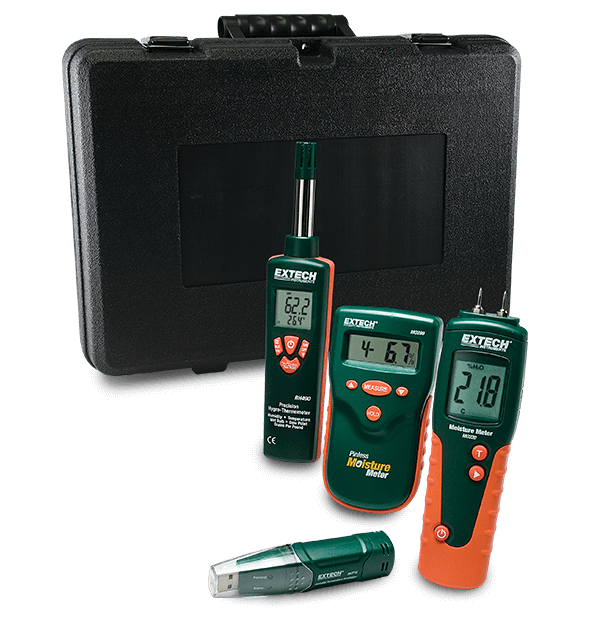 The Extech MO280-RK Restoration Contractor's Kit is a complete solution for the restoration contractor. This kit uses pins and pinless meters to better diagnose the amount of moisture content in a certain material. The thermal hygrometer provides a fast and accurate reading of ambient room conditions and GPP calculations. This kit is a supplied in a rugged hard carrying case. The kit features the MO280 Pinless Moisture Meter which displays 0% to 99% moisture from a selection of 10 different wood types. The MO220 Wood Moisture Meter comes with integral pins and a remote pin probe that displays up to 99.9% of the moisture level with 8 different wood types with calibrations for approximately 170 wood species. The kit also includes the RH490 Precision Hygro-Thermometer which has a 2% RH accuracy and a fast 30 second RH response time. Measures humidity, temperature, dew point, wet bulb, GPP and g/kg. The Extech MO280-RK Restoration Contractor's Kit also includes the RHT10 Humidity and Temperature USB Datalogger that records up to 16,000 readings each of RH and temperature. The USB interface and software is included in the kit.