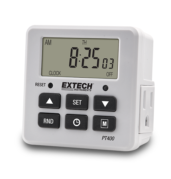 The Extech PT400 provides flexible, energy-saving solutions for your day to day use of appliances in the home or office. It features three selectable power settings (manual on, manual off, and auto), ten customizable on/off programs, and sixteen program combinations for individual days, weeks, and more. It simultaneously displays the time of day in 12 and 24 hour format, day of the week, and the currently selected program. It also has daylight savings mode, randomize program function, and a countdown timer. Design includes standard North American 3-prong electrical plug, side-socket connection for ease of use, and rechargeable backup battery that saves customized programs in the event of a power outage.