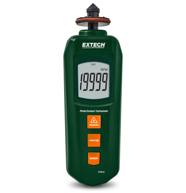 The Extech RPM40 is a pocket Contact/Laser Photo Tachometer that provides wide RPM (photo/contact) and linear surface speed measurements. The characters on display reverse direction depending on which measurement mode is currently in use. The narrow beam laser photo tachometer is for accurate, non contact RPM measurements up to 1.5 m (4.9 ft) from the target for improved safety and accessibility. Complete with cone tip and wheel for RPM or linear surface speed, four 1.5 V AAA batteries, and reflective tape.