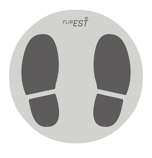 Five gray queue marker floor stickers for skin temperature screening stations, 400 mm (15.8 in) diameter.