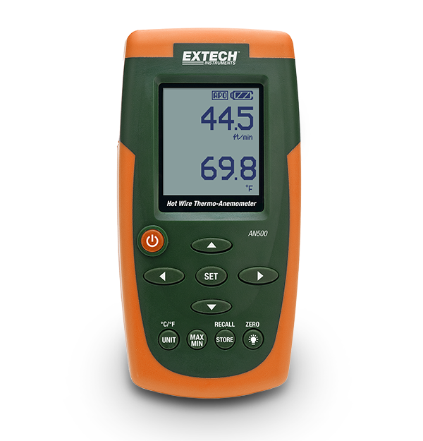 The Extech AN500 is a Hot Wire CFM/CMM Thermo-Anemometer. New sensor technology delivers major improvements in its durability and ATC (automatic temperature compensation) for accurate, in-duct, air velocity measurements with changing air temperatures. Its telescoping probe with ruler label ensures that measurements are made in the center of the duct, even if it is out of reach. Its ergonomic directional handle and anti-rotation sensor confirms that the probe direction and airflow direction are aligned for confident readings. Complete with telescoping probe with cable, 100 V to 240 V AC universal adaptor with 4 plugs, 6 batteries, and a hard carrying case.