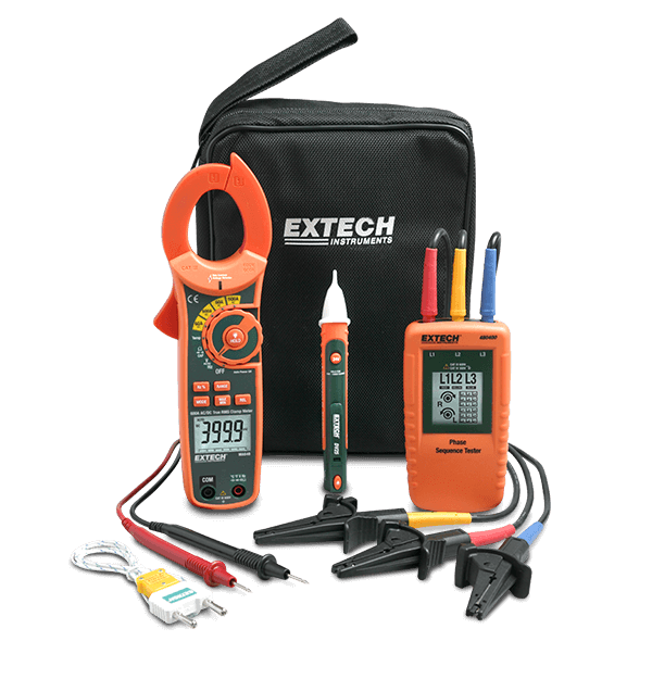 Ideal for plant maintenance, the Extech MA640-K Phase Rotation/Clamp Meter Test Kit includes a True RMS Clamp Meter, 3 Phase Rotation Tester, and a CAT IV AC Non Contact Voltage Detector. The clamp meter has a 6000 count display and advanced measurements features like capacitance, frequency, duty cycle, and Type K temperature. The phase rotation tester has easy to open, wide jaw alligator clips and a durable double molded housing. The dual range NCV detector with audible and visual indication has a built in flashlight. Kit is supplied in a CA900 carrying case that provides protection and organization for the meters.