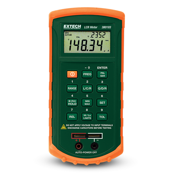 The Extech 380193 is a Passive Component LCR Meter which measures inductance, capacitance, and resistance, with secondary parameters of quality, disperation, or resistance. Set Hi/Lo limits using absolute values or percentage limits. Allows for automatic blown fuse indication.