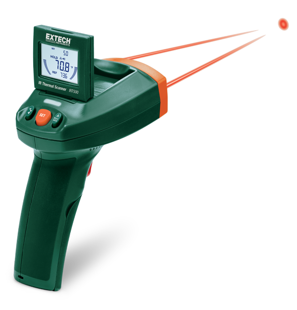 More than just an IR Thermometer, the Extech IRT500 IR Thermal Scanner is designed with a dual laser, an audible/visual alarm feature, 5 preset threshold settings (1°, 5°, 10°, and set min/max), and 3 color LED indicators to make it easy to locate hot and cold spots quickly. Users simply point at targets and scan. The 3 color LED indicates high (red), normal (green), or low (blue) when scanning for temperature irregularities. Likewise, the audible alarm increases as temperature increases or decreases. It features a fast, 150 millisecond response for capturing spikes in temperature. The dual laser indicates ideal measuring distance where the 2 lasers converge to a 2.5 cm (1 in) target spot. Other features include a tilt adjustable LCD display with bright white backlight and dual barographs. Trigger lock function provides continuous use for scanning large areas. Comes with 9 V battery, carrying case, and user manual.
