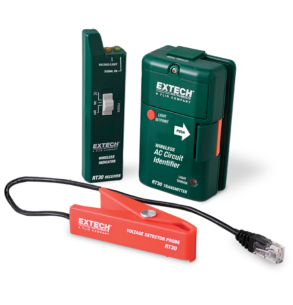 The versatile Extech RT30 uses a pager sized, non contact voltage detector transmitter which clamps onto wiring mid run and transmits a "voltage present" signal to a pocket sized receiver carried by the user. Clamped onto a live wire, the transmitter signals the user at the breaker panel with LED and audible alerts on the receiver (up to 100 m range). The alerts stop when the correct circuit breaker is switched and work can then be performed safely. Complete with the RT30 Wireless Remote AC Circuit Identifier transmitter and receiver is a remote clamp style probe, 4 AAA batteries, pouch case, and operating instructions. USA, Mexico, and Canada use the 914 MHz model and majority of other countries use 869 MHz model.