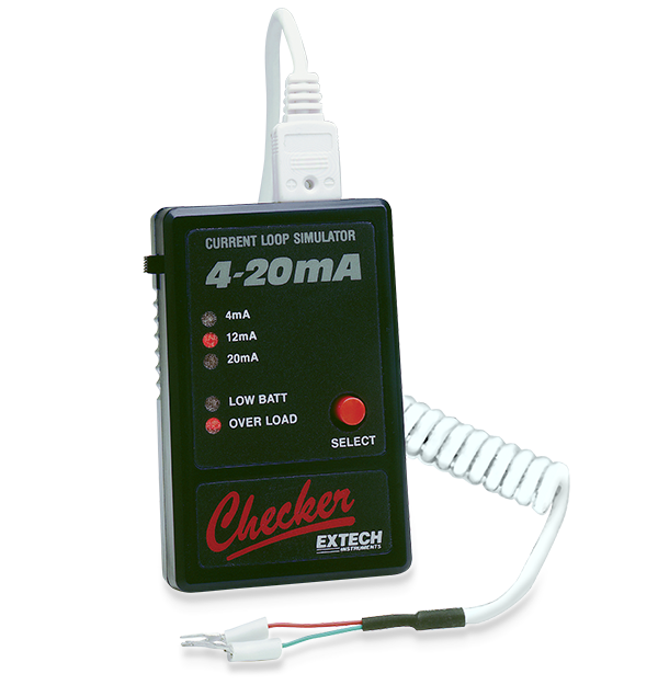 The Extech 412440-S is a low cost, pocket-sized Calibration Source Checker for simulating current loops and for providing a quick and easy way for checking calibration of meters or controllers. It sources three current levels (4 mA, 12 mA, and 20 mA). Bright red LEDs indicate simulation output and battery status. An overload indication occurs when a load exceeds 240 ohms. Comes complete with 9 V battery, case, and calibration cable terminated with subminiature and spade lug connector.