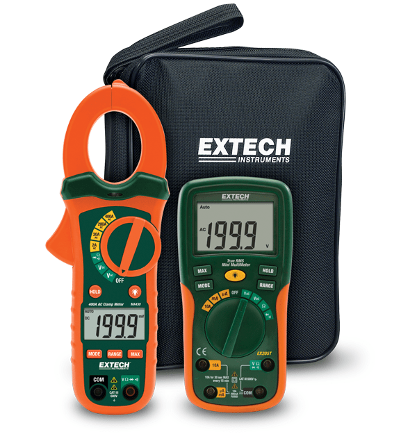 This Extech ETK30 Electrical Test Kit is assembled to provide all the electrical testing needs for the installation and repair of electrical systems and HVAC equipment. It is a True RMS Digital Multimeter that auto ranges, has a 2000 count large LCD display, and has a CAT III 600 V safety rating. It features low current capability with resolution to 0.1 µA, as well as max hold, data hold, and auto power off functions. The kit also includes the MA430, a 400 A AC Clamp Meter + NCV with 6 functions including AC Current, AC/DC Voltage, resistance, diode, and continuity. The MA430 also has a 3 cm (1.2 in) jaw size for conductors up to 350 MCM, a backlit display, data hold, auto power off, and low battery indication.