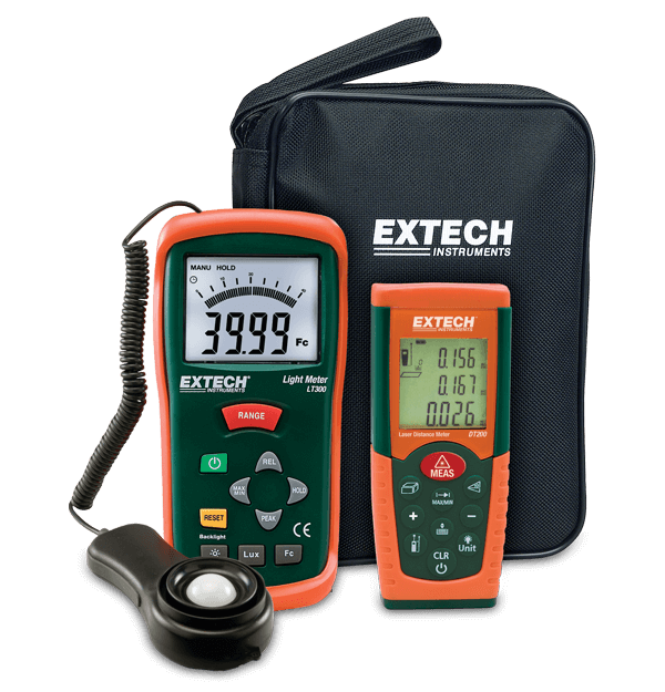 Designed for professionals who audit existing and replacement lighting systems for energy efficiency and lighting performance, the Extech LRK10 Lighting Retrofit Kit is ideal for verifying lighting system output after installations and retrofits. The kit features 2 compact tools that are indispensable at various locations: the easy-to-use LT300 light meter that measures up to 200,000 Lux/20,000 Fc, and the DT300 laser distance meter with built-in tools to quickly calculate area, even in hard to measure locations. The kit is supplied in a soft carrying case that provides protection and organization for the meters and accessories.