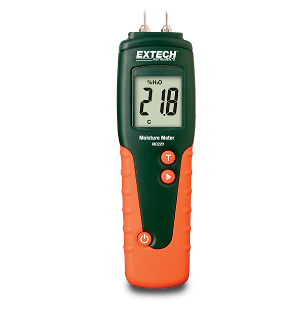 The Extech MO220 is specifically designed for monitoring moisture in wood. The memory contains 8 wood groups with calibrations for approximately 170 species of wood. Measurements can be taken using the integral pin electrodes or the included heavy duty remote probe. It is designed in a rugged, double molded housing construction and is pocket sized for one-handed operation. The MO220's functions include calibration check, user settable auto power off (1 to 9 minutes) with disable, and low battery indication. Complete with protective cap, temperature probe, heavy duty remote moisture probe, replacement measurement pins, two AAA batteries, and a soft case.