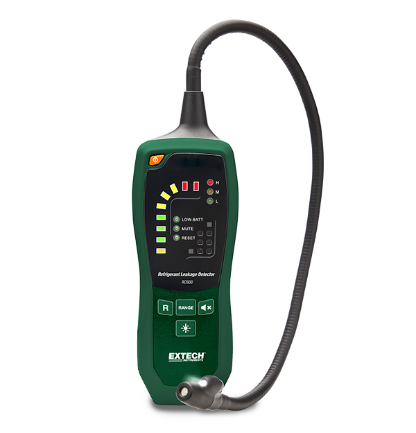The Extech RD300 Refrigerant Leak Detector detects leakages from air-conditioning units and cooling systems. It is easy to use and ideal for detecting leaks from air-conditioning units and cooling systems that use all standard refrigerants. The multi-colored LED light bar indicates the level of leaking refrigerant detected by the RD300. The built-in, bright LED convenience light located at the sensor tip illuminates dimly lit inspection areas. Complete with leak test bottle, 9 V battery, and protective hard carrying case.