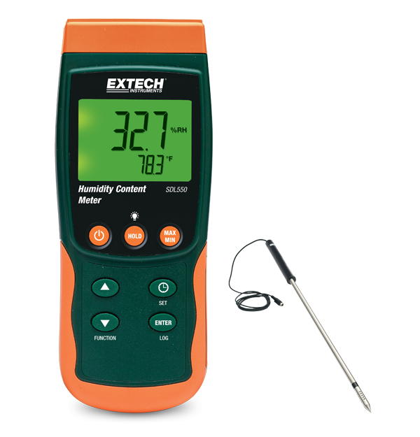 The Extech SDL550 Humidity Content Meter/Datalogger monitors moisture in many different materials like grain, corn, rice, cotton, or paper. The 600 mm (23.7 in) heavy duty stainless steel probe with a replaceable probe head and inner filter measures moisture content from 10% to 95%, temperature, and dew point. The datalogger date/time stamps and stores readings on an SD card in Excel™ format for easy transfer to a PC. It has an adjustable data sampling rate from 1 sec to 3600 sec, and it stores 99 readings manually plus 20 M readings via 2G SD card. Other features include a large backlit dual LCD display on which you can use functions such as record, recall, min/max, data hold, and auto power off. Complete with 1.5 m (4.9 ft) cable, sensor cap, SD card, 9 V battery, and soft carrying case.