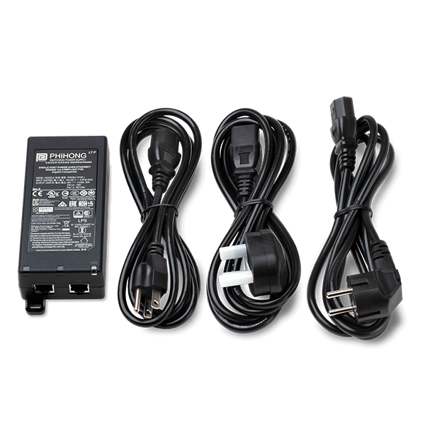 This Power over Ethernet (PoE) Injector provides enough power for both the FLIR A500f/A700f camera and the internal fan inside the housing. Includes power supply and PoE injector including multi plugs.
