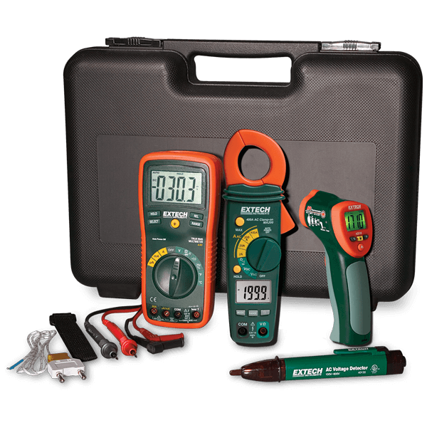The Extech TK430-IR is a true RMS multimeter, clamp meter and IR thermometer kit. It is ideal for electrical testing needs such as the installation and repair of electrical systems, HVAC equipment, and large appliances. Included is the the EX430 True RMS Auto Ranging Multimeter with 11 functions, the MA200 400 Amp Clamp Meter with basic AC Current and 1 mA resolution, the 42510 InfraRed Thermometer with laser pointer, and the 40130 Non-Contact Voltage Detector that measures 100 V to 600 V AC. The TK430-IR is complete with a set of test leads and Type K bead wire temperature probe. Supplied in a heavy duty hard carrying case that provides protection and organization for meters and accessories.