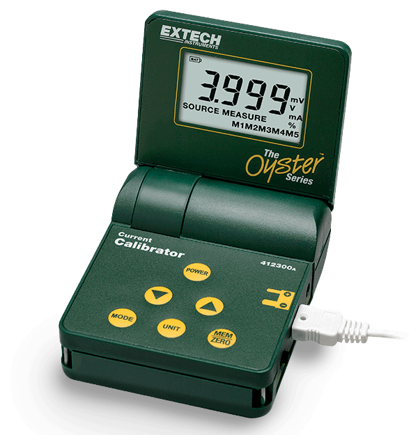 The Extech 412300A is a Current Calibrator and Meter. Precision source for calibrating process devices and measure DC process signals from 0 mA to 24 mA with its large LCD. It displays readings in mA, as a percent of the 0 mA to 24 mA range, or as mV in voltage ranges. Additional features include a touch keypad, five stored calibration values, and 24 VDC power to measure two-wire current loops. Complete with a 9 V battery, calibration cable with spade lug terminals, carrying case, neck strap, and an AC Power Adapter.