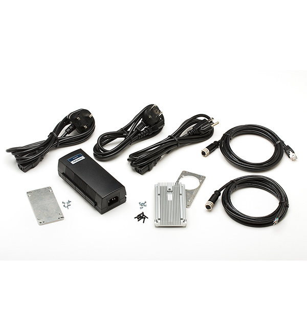 The FLIR AX8 accessory starter kit consists of the following items: T128390ACC, Ethernet cable, M12 to RJ45; T199163, Front mounting plate kit; T128775ACC, Rear mounting plate kit; T199019, PoE injector, incl. cables; T128391ACC, Cable, M12 to pigtail;