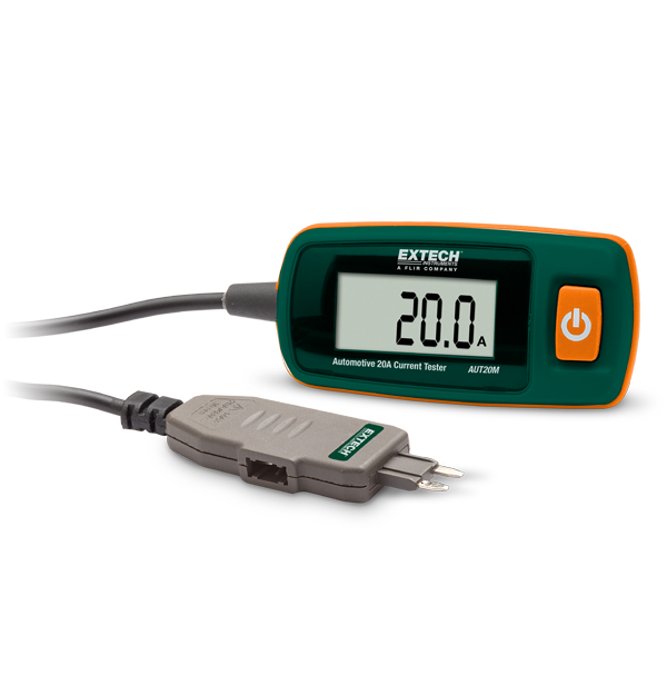Check up to 20 Amps without breaking the circuit with the Extech AUT20M Current Tester. Mini-blade connectors plug into the fuse block. It has a measuring range of 20 Amps/48 VDC (10 seconds max) with 10 mA resolution and ± a (2% + 2 digits) accuracy. Results are displayed on a 3.5-digit LCD. Includes 75 cm (29.5 in) connector cable.
