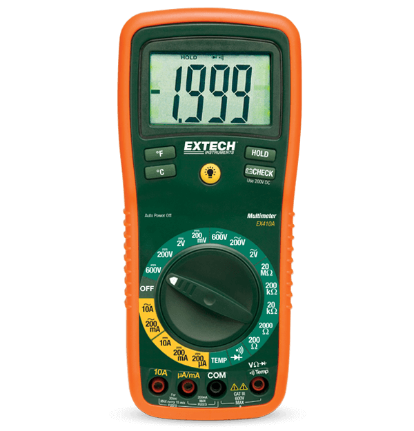 Compact and powerful, the Extech EX410A Eight-Function True RMS Professional MultiMeter provides the versatility of multiple meters in one convenient device. The EX410A measures AC/DC voltage and current, resistance, diode, and temperance. A large, backlit display and 1-inch high digits allow for easy reading, while the ergonomically designed housing offers comfortable, one-handed operation. Comes with Multimeter, CAT III test leads, stand, hanging strap, holster with built-in test lead storage, Type K bead wire temperature probe, and battery.