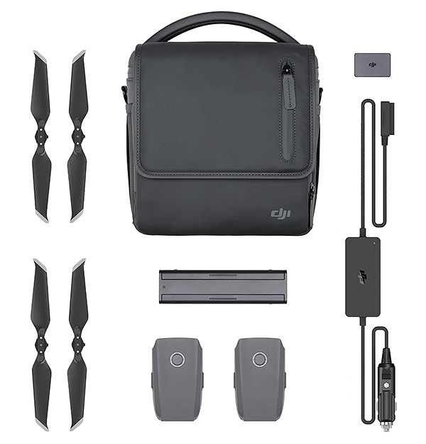 Expand your flight time, charging options and keep spare parts on hand. Kit includes: Intelligent Flight batteries (2), Mavic 2 car charger, battery charging hub, power bank adapter battery, low-noise propellers, Mavic 2 shoulder bag.
