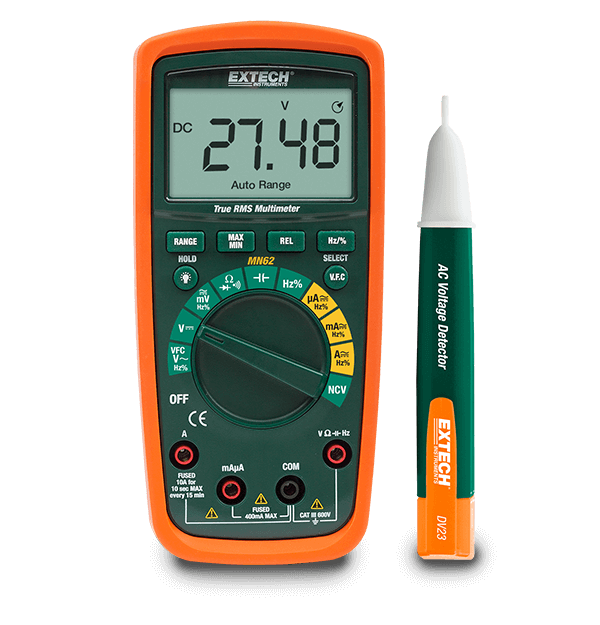 The Extech MN62-K is a compact True RMS Multimeter that comes with a free non-contact Voltage Detector (NCV). The multimeter allows for accurate readings of noisy, distorted, or non-sinusoidal waveform, and the voltage detector spots 50 V to 600 V (50 Hz/60 Hz). These two products are ideal for troubleshooting appliances, electrical wiring, automotive repair, and electronic devices.