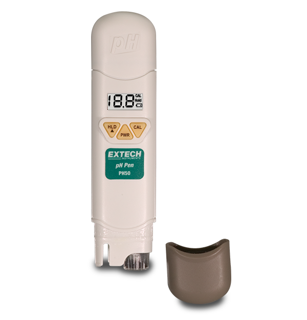 The Extech PH50 Waterproof pH Pen has a pH range of 2 pH to 12 pH with a LCD display that shows the pH readings. It makes it easy to calibrate a single CAL key with the automatic pH buffer recognition (4 pH, 7 pH, and 10 pH). The user has a choice of a 3 point calibration for better accuracy. This pen features the data hold which freezes the readings on the display as well as a low battery indicator. It also features an auto power off to help conserve the battery life. The PH50 comes complete with a built in electrode, sensor cap, inner pH electrode protection cap, and four LR44 button batteries.