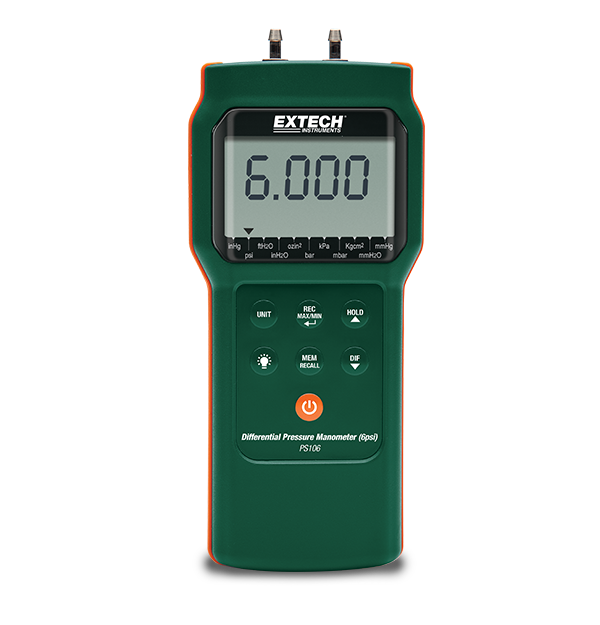 The Extech PS106 Differential Pressure Manometer is ideal for field, manufacturing, or lab/R&D use. It offers a 6 psi range, readings in 11 units, and high resolution. The manometer also features a large LCD display with backlighting, data hold, auto power off/disable, and a zero function for offset correction or measurement. This product is complete with 6 AAA batteries, two connection hoses, and a hard carrying case.