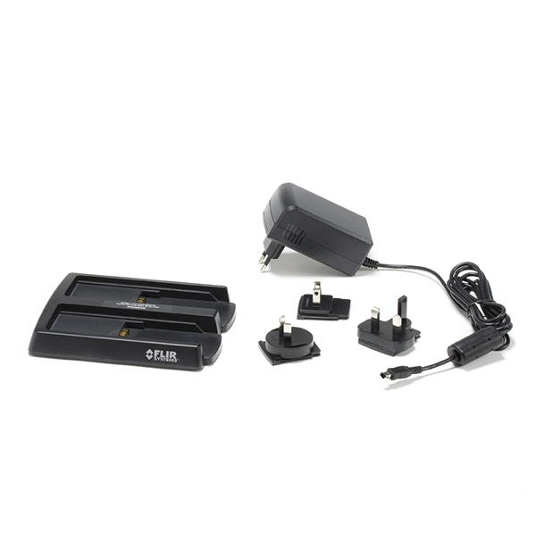 Stand-alone 2-bay battery charger, including power supply with multi plugs.