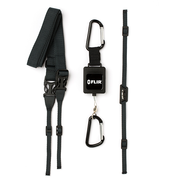 The FLIR K65 accessory starter kit consists of the following items: T127722ACC, Retractable lanyard; T127724ACC, Neck strap; T129915ACC, Carabiner strap; T198416ACC, Lanyard strap